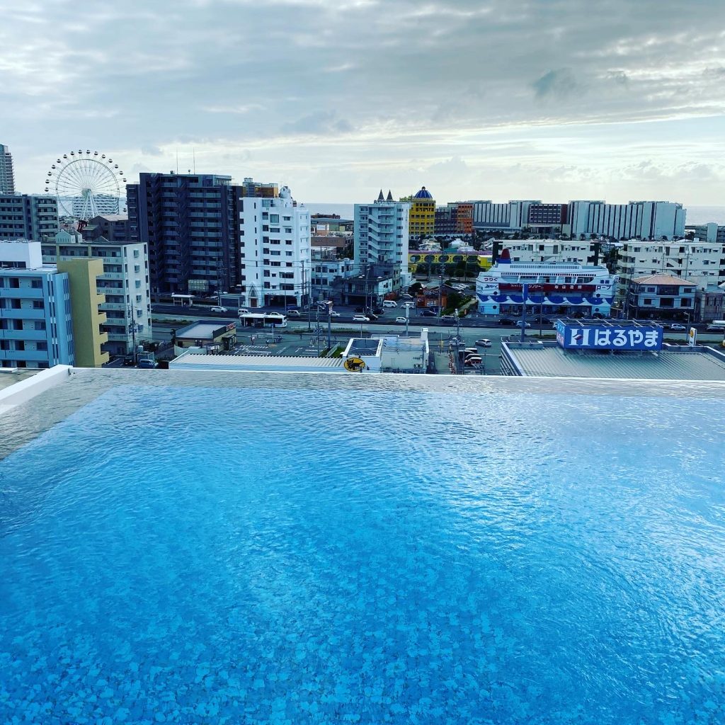 インフィニティープールって、空や海と繋がってるように見えるプールのことだっけ。プールの先は、青い空。よく見ると、海も見えました。プールサイドで飲むビールの旨いこと。 -