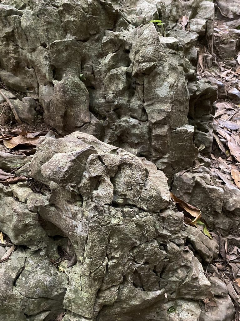 琉球石灰岩が雨水等に侵食してできたカルスト地形で、ゴツゴツ尖った岩の上を歩くことになります。