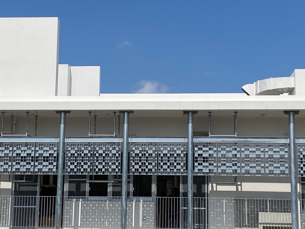 建物の外観、近くで見てみるとミンサー織ですね。