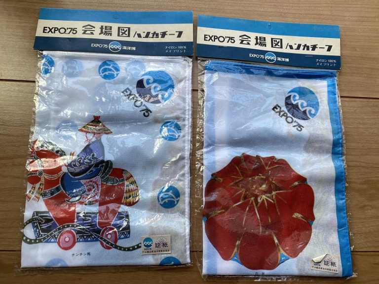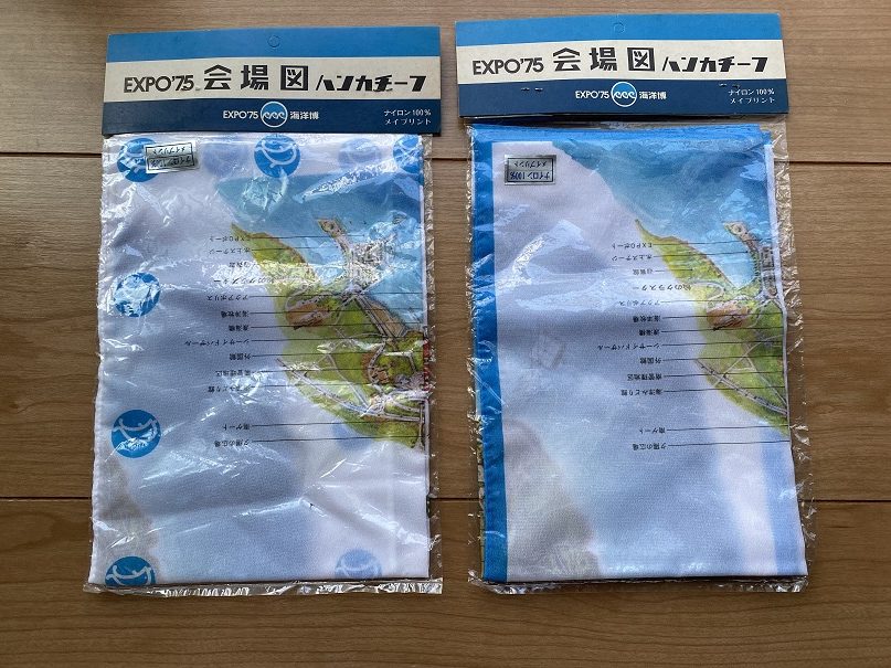 十数年前に知人から譲り受けた沖縄国際海洋博覧会の会場図ハンカチーフ。