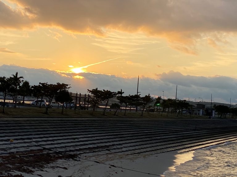 勝連グスクから車でちょっと行ったところにある、海中道路からの夕日