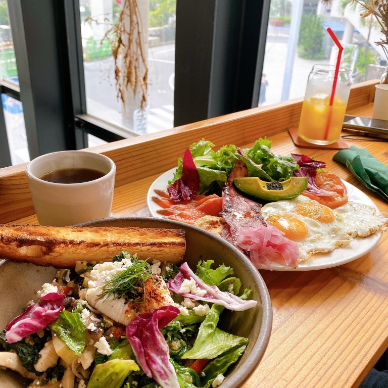 たっぷりの野菜に、サーモン、ベーコン、目玉焼きが2個、そしてその下にはパンが隠れていました。