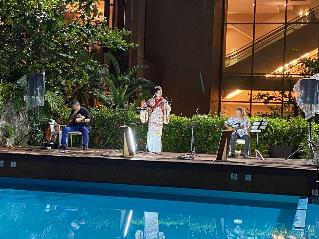 プールサイドで、三線(サンシン)の演奏と歌を聞きながら飲む「75ビール」は、美味しかった。