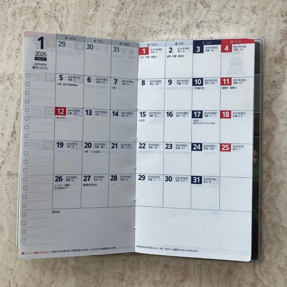 月間ブロック、1週間の予定、メモ記載ページがあり使い勝手が最高です。